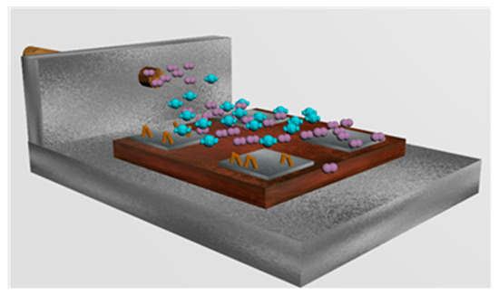The sensing layers consist of pristine tungsten oxide nanowires directly grown on top of the membranes of a 4-element micro-machined silicon transducer employing an Aerosol Assisted Chemical Vapor Deposition (AACVD) process. Each membrane within the 4-element chip contains POCl3-doped polysilicon heaters (16 Ω/sq, 0.47 μm thickness, and TCR = 6.79 × 10−4/°C) and platinum electrodes (0.2 μm thickness, electrode gap = 100 μm). To electrically insulate the electrodes on top from the heater, 800-nm-thick silicon oxide layers were deposited by Low Pressure Chemical Vapor Deposition (LPCVD). In the AACVD growth of tungsten oxide nanowires, tungsten hexacarbonyl (50 mg, Sigma-Aldrich, Saint Louis, MO, USA, ≥97%) dissolved in a mixture of acetone and methanol (15 mL of acetone and 5 mL of methanol, Sigma-Aldrich, ≥99.6%) was used. The solution was kept in a flask and placed in an ultrasonic humidifier.