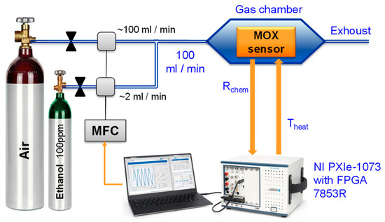 Accordingly, the measurement setup described in Figure 5 has been used. The sensor was placed inside a gas chamber. To set different target gas concentrations, a calibrated ethanol cylinder with air as balance gas was used. This was further diluted by employing a cylinder of dry air and a computer-controlled mass flow meter system. The total flow into the chamber was kept constant at 100 mL/min throughout the experiments. The dead volume within the gas chamber was 4 mL. The periodical measurements of the chemical resistance of the sensing layer and the application of the BIT0 and BIT1 temperature waveforms are implemented using a standard FPGA-based National Instruments PXIe-1073 acquisition equipment controlled from the same computer. The experimental data was post-processed using standard MatLab software.