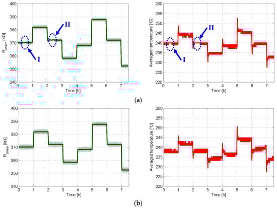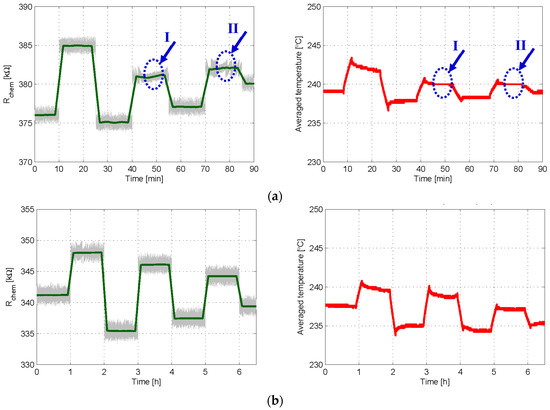 Experimental results in which 1st and 2nd order controls are used to obtain a given sequence of target chemical resistances Rth. (a) Time evolution of the chemical resistance (Left) and of the average temperature provided by the 1st order loop (Right); Rth was set to 376, 385, 375, 381, 377, 382, and 380 kΩ in 15 min intervals; Thigh = 280 °C, Tlow = 200 °C, δ = 25%, and TS = 1 s; (b) same results when 2nd order control was applied to set Rchem to 341, 348, 335, 346, 337, 344, and 339 kΩ in 60 min intervals; Thigh = 280 °C, Tlow = 200 °C, α = 2 kΩ, δ = 20% and TS = 2 s. In left plots, the grey lines are the raw signals at the sampling frequency, while the green one is the moving average obtained with 200 samples.