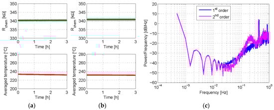 The last experiment reported in this section aims to compare the behavior of the two control loops in terms of quantization noise in the output bit stream. As it has been said before, a first order sigma-delta topology produces a zero of first order. This means a slope of approximately 20 dB/decade in the quantization noise near zero frequency. With the second order control, a slope of approximately 40 dB/decade should be obtained. To observe this effect, the sensor was placed again in synthetic air and each type of control with TS = 0.5 s was applied for 3 h to set a target chemical resistance of 340 kΩ. As shown in Figure 8a,b, constant chemical resistance and constant average temperature are successfully achieved with both control methods.