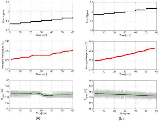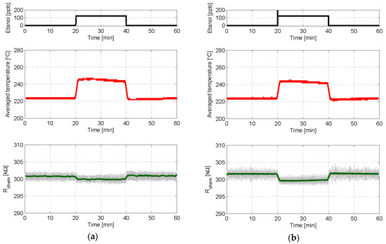 Experimental results in which either a 1st or a 2nd order control loop is used to set Rchem to 300 kΩ while a step of ethanol concentration was applied to the sensor. Thigh = 290 °C, Tlow = 160 °C, δ = 25%, and TS = 1 s in both cases; α = 3 kΩ in the 2nd order case. (a) Evolution with time of the ethanol concentration (Top), the average temperature provided by the control loop (Middle), and the chemical resistance (Bottom) when 1st order control was used; (b) same results for 2nd order control. In bottom plots the grey lines are the raw signals at the sampling frequency, while the green one is the moving average obtained with 60 samples.