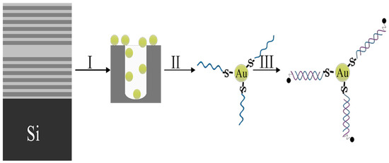The flow-process diagram of DNA detection on metal NPs /PSiMC device. (I) Au NPs adsorbed on functionalized PSiMC; (II) the immobilization of target DNA on Au NPs /PSiMC device substrate; (III) the hybridization of probe RRA-DNA sequences with target DNA.