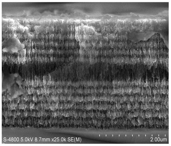PSi was prepared by standard anodic etching technique [21]. The material used is p-type monocrystal silicon <100> (resistivity 0.03–0.06 Ω·cm). The etching solution for electrochemical etching of PSi is 10% hydrofluoric acid alcohol solution. Prior to preparation of the samples, the parasitic layer of highly doped p-type silicon wafer was removed by short electrochemical etching and dissolution in NaOH. It has been proved that the existence of this parasitic film affects the optical properties of the photonic structure, reduces the pore size of the surface [22], and prevents the molecules from entering the porous silicon structure. The preparation parameters of PSiMC are shown in Table 1. As shown in Figure 2, the distribution of MC layers: a cavity layer is introduced into the two symmetrically distributed Bragg reflectors; the corrosion current density of cavity layer is 110 mA/cm2, the A layer is a high porosity layer with a current density of 110 mA/cm2, the B layer is the low porosity layer, and the current density is 60 mA/cm2. The arrangement of the PSiMC structure is (AB)6A4(BA)6, and the resonance cavity wavelength is 635 nm. Bragg reflectors with 14 cycles, which are arranged as (AB)14, are predicted to have the same thickness of MC. The fresh samples were thoroughly cleaned with deionized water and dried under N2 airsteam.