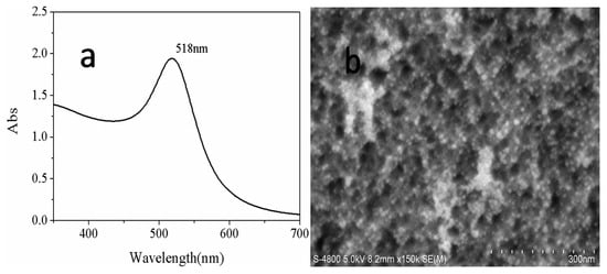 (a) The UV-Vis spectra of Au NPs, and (b) surface morphology of PSiMC after deposition of Au NPs.