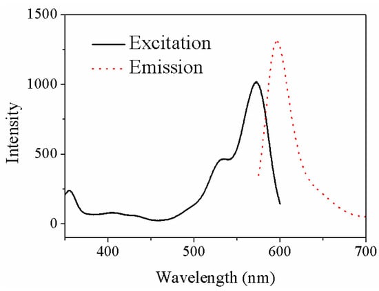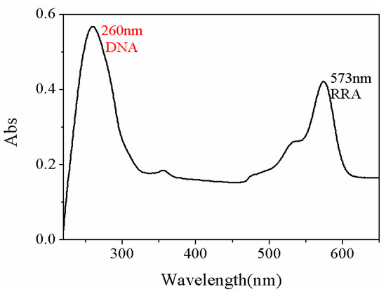 The excitation and emission fluorescence spectra of RRA-DNA fragment are described in Figure 6. The main excitation peaks are 360 nm, 530 nm and 572 nm, respectively. The emission wavelength is 597 nm, which is close to the fluorescence excitation wavelength (572 nm) of RRA-DNA; when measured, it is not conducive to obtaining the complete emission fluorescence spectra. The ultraviolet light of 360 nm easily causes damage to biological molecules, so the excitation wavelength of 530 nm is adopted in the experiment.