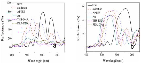 The reflection spectra vary with the preparation process of (a) PSiMC biosensor, and (b) Bragg reflector sensor.