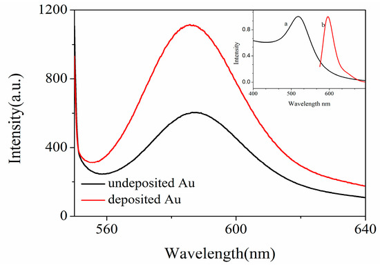 The fluorescence spectra of RRA-DNA obtained on Au NPs/PSiMC sensor substrate and PSiMC substrate without Au NPs (the concentration of RRA-DNA is 1 µM). The inset map shows (a) the absorption spectrum of Au NPs and (b) the emission spectrum of RRA.