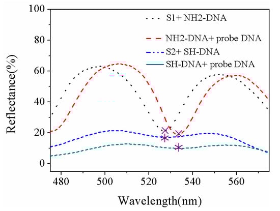 The movement of the reflection spectra from the probe DNA binds to the sensor substrates. The first type sensor substrate (S1) functional with glutaraldehyde, is easy to connect with amino-modified DNA fragments; the second type sensor substrate (S2) is readily connected sulfhydryl -modified DNA by adsorbed Au NPs.