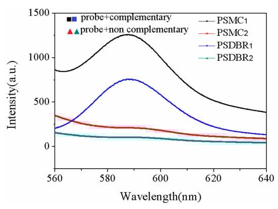 The fluorescence spectra of RRA-DNA detected on PSi biosensor. The concentration of RRA-DNA is 1 µM. There are two spectra from two different samples for one kind of sensor. One of the spectra is the fluorescence spectrum for the detection of complementary probe DNA (the solid square), and the other one is the spectrum for the detection of non complementary probe DNA (the solid regular triangle).