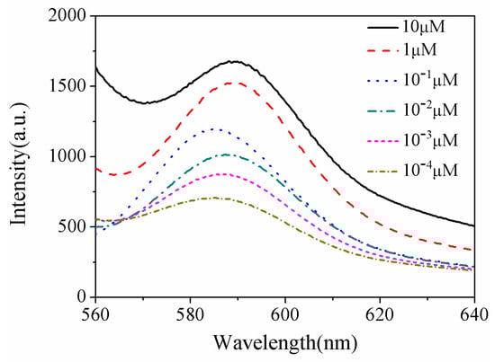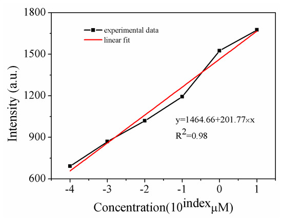 THS-DNA (10 µM, 50 µL), which was connected with Au NPs/PSiMC substrate, causes hybridization under different concentrations (10 µM-10−4 µM, 40 µL) of complementary RRA-DNA. The fluorescence spectra are shown in Figure 11. There is a red shift for the emission peak of the fluorescence spectra with increasing DNA concentration. The reason for this phenomenon is that more DNA will attach to a gold nanoparticle with increasing DNA concentration, making the particle size increase and a red shift for the emission peak of the fluorescence spectra. According to the linear fitting graph (Figure 12), it shows a good linear correlation between the fluorescence intensity and the concentration, the minimum detectable concentration can reach 10−5 µM. Let us note that the sensitivity of the presented simple preparation and low cost assay is superior to that reported for complex biochip [31], enabling the detection of IgG molecules at the concention of 11 pM and Au nanograting [32] for the detection of DNA (100 pM).