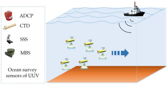 In recent years, underwater mobile sensor networks have been rapidly developed and widely used in marine science and engineering fields. Compared with traditional static sensor networks, the underwater mobile sensor networks [] can realize dynamic, large-scale sensing and operation at a lower cost. Due to the autonomous properties [], multi-UUV, regarded as intelligent and reconfigurable underwater mobile sensor networks [,], have found an increasingly wide utilization for combined investigation, cooperative survey, and coordinated exploration []. Usually, multi-UUV sensor networks adopt a formation mode when sailing and working, which are propitious to information interaction and cooperative operation between UUVs. Thus, good formation control [] is necessary and important for improving operation efficiency and reducing energy consumption of multi-UUVs.