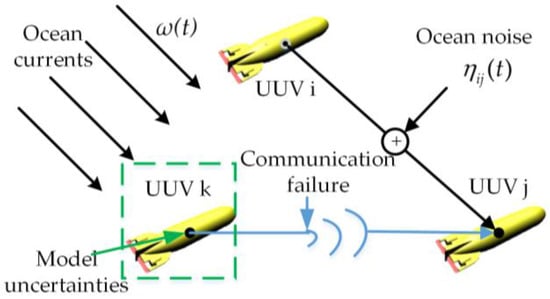 As is well known, in the difficult underwater communication environment, most communication systems on land cannot be applied in the design of UUVs, and the exchange of information between UUVs can only pass through limited underwater acoustic links which is characterized by low stability. In fact, how to design the formation control scheme while taking into account the practical means of communication for a multi-UUV system is a great challenge and has not been fully studied. In recent years, there are many studies regarding the narrow band and time delay of the acoustic communication of multiple UUVs [,], but fewer studies regarding the communication failures which have a serious impact on the stability of communications. Due to the link failure, which is a temporary disruption in an acoustic link caused by the complex underwater environment, the communication topology of multi-UUVs may fail to remain constant, but dynamically change over time. Moreover, the underwater acoustic links are seriously influenced by marine background noises. Thus, how to obtain valid communication information is very important for the UUV formation control.