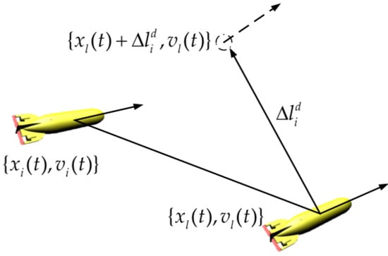 In this paper, the leader is fully-functional, guides the whole formation, and can transmit its position and orientation , and velocity , to all followers. Each follower maintains a desired geometric configuration with the leader. For UUV leader-follower formation, the leader is defined as the fixed reference point . Thus, the expected state of each follower UUV is that , is the fixed relative distance to the leader (Figure 3).