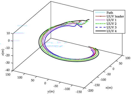 The control gains of the leader-follower UUV formation controller are and , where , . The leader is operated on the desired path which is designed as a spiral curve: