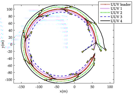 Figure 5 shows the three-dimensional trajectory of each member in the leader-follower UUV formation. As shown in the figure, the leader UUV is responsible for tracking the desired spiral curve path, and each follower UUV tracks the leader UUV according to its desired relative distance and angle, regardless of tracking the spiral curve path. The ultimate control result is that the whole multi-UUV system tracks the desired spiral path with the desired triangle formation structure. Figure 5 shows that, after an adjustment period, the randomly-placed follower UUVs can stably converge to a desired formation structure, and the leader-follower formation can, primarily, keep tracking the desired path. The two-dimensional trajectory of the leader and follower UUVs are shown in Figure 6. The red and yellow filled triangles on each trajectory denote the heading of the leader UUV and follower UUVs, respectively. It can be shown in Figure 6 that the initial positions and headings of each follow UUV are disorderly, which is not conducive to constructing a formation and track spatial path. However, under the formation control law, each follower can reach and keep the desired relative distance and relative angle with the leader after an adjustment period, and the leader and all followers can maintain the desired triangle formation structure.