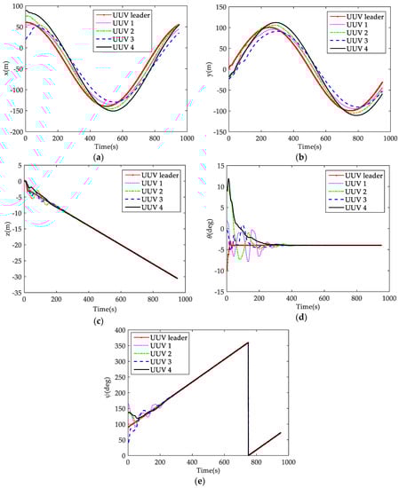 Position and attitude states of the UUVs: (a) state of each UUV; (b) state of each UUV; (c) state of each UUV; (d) pitch of each UUV; and (e) heading of each UUV.