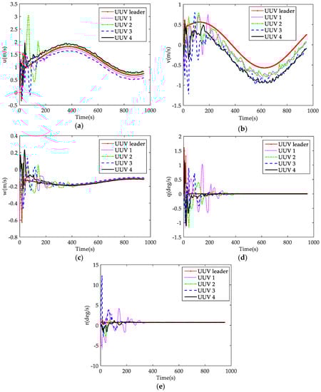 Velocity states of the UUVs: (a) velocity of each UUV; (b) velocity of each UUV; (c) velocity of each UUV; (d) angular velocity of each UUV; and (e) angular velocity of each UUV.