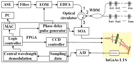 The light from amplified spontaneous emission (ASE) is filtered to nanosecond pulses. A pulse generator, realized by FPGA logic, drives the EOM, which functions as a gating device as well as a first-stage optical amplifier. The signal is amplified by the second-stage optical amplifier, an Erbium-doped fiber amplifier, and then fed to port 1 of the optical circulator. Port 2 of the optical circulator directs the signals to the FBG array by wavelength division multiplexing (WDM). The reflected signal from the FBGs returns to the input port of SOA via WDM in port 3 of the circulator. Based on the light reflection time, which is determined based on the spatial location of every FBG along the network, the FPGA generates a time-shifted pulse sequence to activate the SOA to filter and amplify one specific FBG spectrum while absorbing other interface signals, including the reflected spectrum of other FBG sensors. Both the EOM and SOA are controlled by the FPGA logic controller, by applying strict sequential timing constraints, through the fixed phase pulse generator and delay timer, respectively. The InGaAs LIS takes on the role of wavelength demodulator. When the SOA is driven by a time-shifted periodic pulse, the pulse reflected by this FBG will be amplified each time it passes through the SOA. The pulses reflected by other FBGs are blocked. Then, the reflection spectrum of the FBG is measured by the InGaAs LIS. The spectrum of every FBG can be interrogated by changing the delay time. As the SOA is able to work in high-speed switch mode with a minimum switch time of 1 ns, in system initial status, pulse sequences scanning the phase shifter by steps of 1 ns and 0.2 m space resolution, the position of each FBG sensor can be resolved, and the relative phase delay stored. The maximum frequency, which drives the SOA by pulse generator, is defined as the reciprocal of the arriving delay of the FBG at the greatest distance. Generally, the maximum frequency is usually limited by the InGaAs detector demodulation speed if the length of single fiber is less than 5 km.