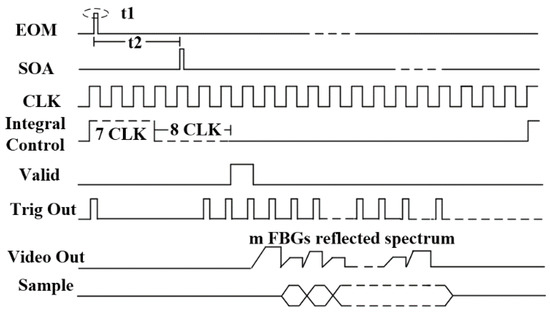 Figure 2 shows an example implementation with G11620 InGaAs LIS and AD9826. The pulse width t1 for EOM and SOA refers to the optical path of the FBG distance. The phase delay t2 for SOA was determined by the FBG position along the fiber array. G11620 started to appear when the Integral Control was low, and the integration was completed after eight clocks. After one clock of digital signal processor (DSP) processing, the video data of the electro-optical conversion was sent out to every clock in sequence. AD9826 was configured in advance to transfer all video data to FPGA for processing. Multiple candidate FBGs’ reflected spectra were sampled simultaneously by the InGaAs LIS in the course of one system scanning period.
