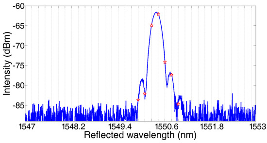 Figure 3. Taking FBG1,1 as an example, the seven stars on the waveform are the corresponding valid sample points, which were mapped onto the InGaAs LIS video pixels. As we can see, only three sample points are located on the main lobe, three points on the first-order side lobe, and one sample point on the second-order side lobe. The sample points on the side lobes will not have a favorable result for the central wavelength demodulation. What’s more, with the waveform shifting in applications, these sample points may lead to an incorrect demodulation result.