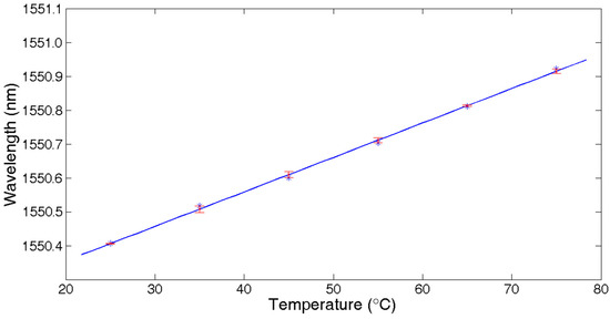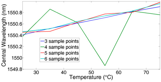 Figure 4 shows, the calculated central wavelength shifts with ambient temperature, changing from 25 °C to 75 °C in steps of 10 °C when using different sample points to calculate the central wavelength. From the experimental results, for the reflected spectrum of this FBG, it can be concluded that using three sample points is able to achieve the best linear curve fitting. The results of using over four sample points are less than satisfactory. This agrees with the spectrum analysis conclusion mentioned above.