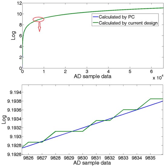 Figure 5 compares the results of the logarithm calculation between a general 64-bit computer server and FPGA logic with a 16-bit A/D.