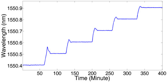 8], the Gaussian fitting algorithm to calculate the central wavelength takes over 0.2 s and the data transmission takes another 0.02 s. Compared to 0.22 s—the average interrogation period—the time for data transmission is negligible in the interrogation scheme proposed in