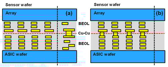 Hybrid bond-stacking schematic, showing the Cu-Cu interconnects outside the array (a) and within the array (b).