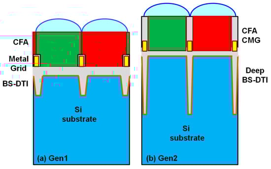 Gen1 (a) and Gen2 (b) schematic; Gen2 BSI stack has thicker silicon, narrower and deeper BS-DTI, and a composite metal-oxide, back-side grid.