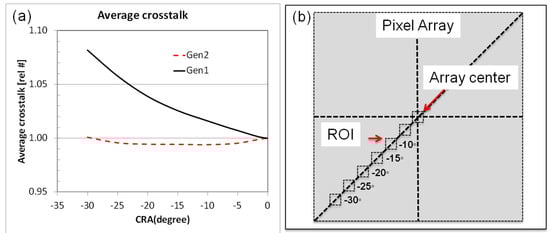 (a) Crosstalk vs angle, calculated from QE curves measured in a fix ROI along a diagonal as shown in the (b). Angles are the CRA of the module lens at each ROI.