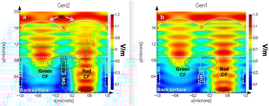 Finite-difference time-domain (FDTD) simulations were used to understand the Gen2 improvement in optical performance. Figure 7 shows the simulation results comparing the Gen2 and Gen1 optical stacks. In the simulation, a 630 nm, monochromatic plane wave (Transverse electric mode (TM)) is used to illuminate neighboring pixels in each structure; the left pixel has a green color filter while the right pixel has a red color filter. The only difference between the pixels in each simulation is the color filter index of refraction. The figure plots the electric field propagation through the micro lens (ML) and color filter. The Gen1 and Gen2 structures are outlined by dashed lines and labeled for clarity. The main difference between structures is the extra silicon dioxide barrier between the color filters in the Gen2 stack. The silicon-dioxide refractive index (~1.45) is lower than that of the CF index (~1.6–2.0), resulting in light reflection at the CF/oxide interface. In the case of Gen1, partially filtered light can pass between color filters, resulting in signal loss due to optical crosstalk. The crosstalk difference is seen in the Figure 7 simulation results; comparing the circled areas, the electric field propagation between color filters is eliminated by the Gen2 CMG. The better light confinement in the CF by the CMG results in higher QE and lower optical crosstalk, which is consistent with the QE data in Figure 4.