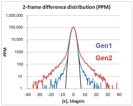 Two-frame difference image, noise histogram comparing the 1 µm, 16 MP images sensors that use the Gen1 and Gen2 technology.