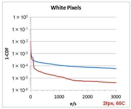 Plot of 1-cumulative density function (1-CDF) comparing the dark image from low white-pixel, PD process. 1 µm, 16 MP (2 fps, 60 C).