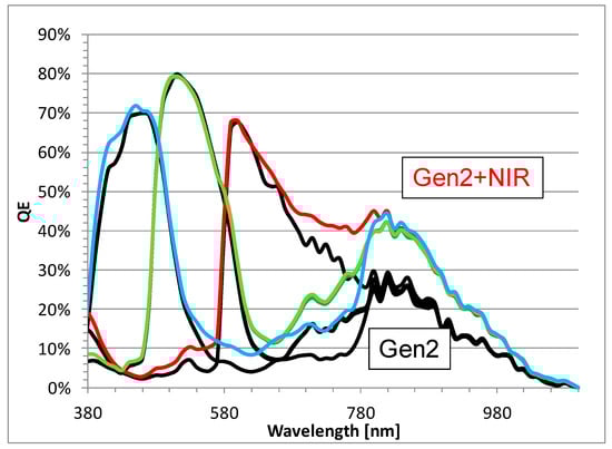 QE comparison from a 1 µm, 16MP Gen2 image sensor to one with an additional process for NIR enhancement.