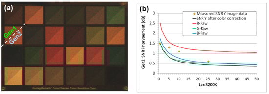 The improvements in the Gen2 over the Gen1 technology are highlighted in Table 1. The higher sensitivity and better SNR10 [10] is achieved by increasing the BSI silicon thickness, extending the BS-DTI deeper, and introducing the CMG. These optical benefits are maintained at sub 1 µm pixels, such as 0.9 µm. The lower noise is due to an improved source follower design and process, while the dark current improvement is achieved by photo-diode and surface passivation engineering. The higher QE and low crosstalk, as well as the improved noise, results in excellent low-light performance, as is shown in Figure 11, where Macbeth chart images taken by a Gen2 and Gen1 CIS sensor at 5 Lux are overlaid for comparison. Figure 11b plots the simulated and measured improvement in SNR vs lux level for a 1 µm Gen2 CIS product. The SNR improvement is most significant at low lux levels. The Gen2 technology is currently in mass production for 1.1 µm, 1.0 µm, and 0.9 µm pixel CIS products.