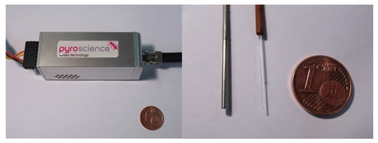 Left: Photographic images of the compact phase fluorometer from PyroScience. Right: from left to right: photographic image of resistance thermometer PT-100, fiber optic temperature microsensor and 1 euro cent for size comparison.