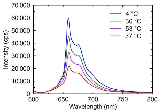 It is evident that a temperature increase reduces the emission intensity across the entire spectrum and does not result into any significant change in the spectral features. Additionally, no measurable shift of the narrow peak at 660 nm was observed with increasing temperatures as reported for other Mn compounds []. Consistently with what was previously reported for Mn concentrations between 0% and 0.25% [], the spectrum associated with the E → A transition maintains identical features up to 1% concentration.