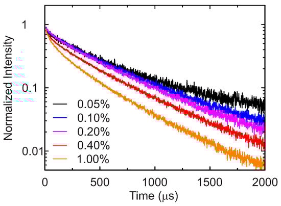 Normalized luminescence intensity decay at 20 C for samples with different doping concentrations.