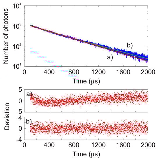 To determine the decay time, the luminescence intensity curves were fitted using both a monoexponential and a double-exponential decay function. In the upper panel of Figure 5, the time-domain intensity decay at 20 C for the sample with 0.20% doping is shown as an example. The data were fitted using monoexponential decay response (Figure 5a, red line) and a double-exponential decay response (Figure 5b, green line). To estimate quantitatively the goodness of the fit, a nonlinear least squares analysis was performed and the reduced calculated for both cases. For each intensity curve, the deviations were calculated as the difference between the measured and the calculated data, weighted according to the standard deviation of each data point []. These are shown in Figure 5 in the lower panels for both the mono- and double- exponential fit functions.