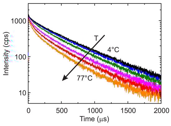 Luminescence intensity decay of the sample with a Mn doping concentration of 0.40% for temperatures the 4 C, 12 C, 29 C, 45 C, 61 C and 77 C. The direction of the increasing temperatures is also shown.