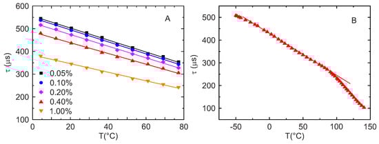 (A) Temperature dependence of the monoexponential lifetime for samples with different Mn doping concentrations; (B) Temperature dependence of a sample with 0.40% doping concentration in a broader temperature range obtained in the frequency domain. Points: Measurements, solid lines: linear fit. In B, the linear fit is performed in the temperature range from −30 C to 80 C.