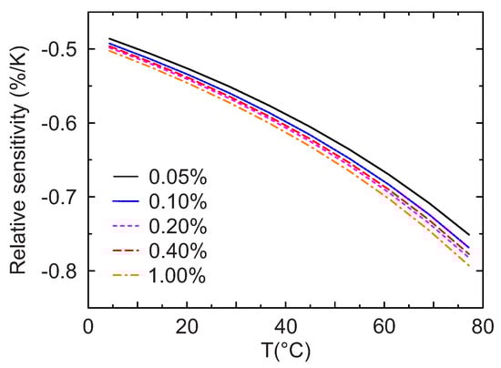 is shown in Figure 8, where is the observed lifetime, and are the variations of the lifetime and temperature respectively. As can be seen from Figure 8, the relative sensitivity is similar for all doping levels, with values between −0.5%/K at low temperatures and −0.8%/K at approximately 80 C. These results show that for all the concentrations this material maintains a high sensitivity over the entire range of temperatures investigated.
