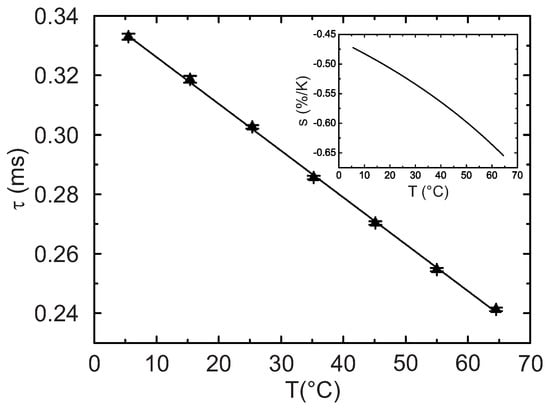 Temperature dependency of the luminescence decay time for the fiber optic temperature microsensor. The insert shows the relative sensitivity.