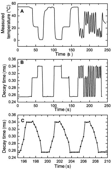 Although optical temperature sensors can be easily realized in a variety of formats including planar optodes and spots, fiber optic microsensors, particularly, offer strong advantages over conventional analytical tools, such as resistance thermometers, in respect to the response times. In fact, their small size (Figure 2) allows for virtually instantaneous response. This advantage is clearly demonstrated in Figure 11. It is evident that the resistance thermometer can only resolve comparably slow temperature changes (time 0–150 s) but cannot follow the fast changes in temperature (Figure 11A) resulting in error as high as 10 C. On the contrary, the response of the fiber optical microsensor is much faster (Figure 11B). The response occurs within 1 s time (Figure 11C), however this time is likely to be overestimated due to time needed to transfer the sensor from one beaker to another. Moreover, sensors with smaller diameter are expected to be even faster.