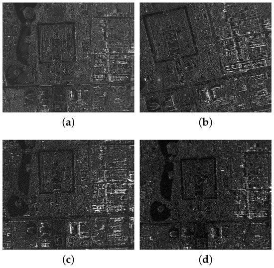 Figure 1. Four GF-3 images of different imaging modes. (a) Spotlight (SL); (b) Ultra-Fine Stripmap (UFSM); (c) Fine Stripmap One (FSMI; (d) Quadrupolarization Stripmap One (QPSMI).