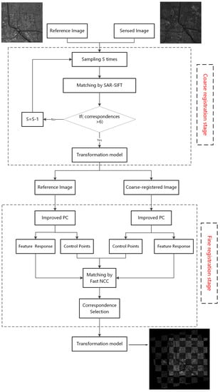 Despite being sensitive to intensity differences and speckle noise, the SIFT-like methods are still useful for initial registration to remove the obvious scale and rotation differences. Meanwhile, the area-based methods like NCC can achieve sub-pixel accuracy when the geometric distortion is small. Combining the advantages of the SAR-SIFT algorithm and the fast NCC method, a robust and efficient coarse-to-fine registration scheme is proposed. The proposed algorithm involves a two-stage process, namely coarse registration and fine registration. In the coarse registration stage, by integrating an adaptive sampling method and the SAR-SIFT, corresponding feature points are extracted. Then, the sensed image is rectified through an affine transform, named the coarse-registered image. In the fine registration stage, uniform control points are first extracted in the reference image. Then, an improved phase congruency model is proposed to extract feature responses for the reference image and the coarse-registered image, and we utilize the fast NCC of feature responses as a new similarity measure. Correspondences are obtained by finding extrema in a local search region that relate to the sampling parameter and error range in the first stage. A correspondence selection strategy is introduced to remove outliers. Finally, the coarse-registered image can be rectified using an affine transform. The flowchart of the whole process is illustrated in Figure 2.
