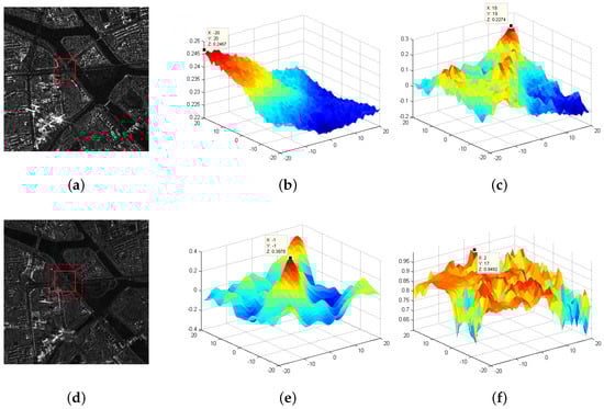 In order to validate the matching performance of the proposed metric, we compare the ISPCC with the fast NCC (fNCC) of the image intensity, the MI of the image intensity and the NCC of local self similarity (LSCC) [8] by the similarity curves. A template-matching experiment is conducted on two correctly-matched SAR images, shown in Figure 4a,d. A template with a size of 51 × 51 is first selected in the reference image, then a local search region of [−20, 20], both in the x-axis and y-axis directions, is set in the coarse-registered image. The 2D similarity curves of four comparative methods are shown in Figure 4b–f, and the peaks are plotted in the curves, respectively. Since the two images have been correctly registered, the correct position is located at the center of the search region. We can see from the curves that only the ISPCC yields the correct result. For the fNCC method, the peak position is far from the center position. For the MI and LSCC methods, they detect several local extrema. Despite the MI and LSCC methods being able to handle nonlinear intensity differences, the test image is corrupted with speckle noise, and the intensity and geometry differences between the two templates are large, making the other three methods no longer suitable. Meanwhile, the running time of the fNCC, MI, LSCC and ISPCC is 0.1 s, 1.4 s, 2.19 s and 0.12 s, respectively (all the experiments were conducted with MATLAB R2014a). Consequently, the proposed ISPCC is not only robust, but also efficient, compared with the three other methods. It should be noted that the template size has a strong effect on the matching performance. More comparative analyses on the template size are presented in Section 5.3.