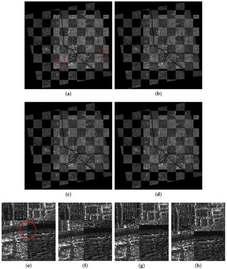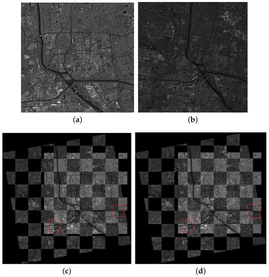 In the coarse registration stage, the AsSAR-SIFT algorithm (combination of the adaptive sampling method and the SAR-SIFT) is first used to eliminate the obvious scale, rotation and translation differences between the reference and the sensed images. Outliers are removed using FSC, and the transformation model is estimated by the correct corresponding keypoints between the images. Finally, the sensed image is rectified by the affine transform to form the coarse-registered image. Figure 5c, Figure 6c and Figure 7c illustrate the coarse registration results of the three image pairs, which are shown in checkerboard mosaicked images. In the fine registration stage, uniformly-distributed Cps are extracted using the feature responses calculated by IS-PC, then template matching is conducted by the ISPCC in a local search region for each Cp. Misregistrations are eliminated by a selection strategy. The coarse-registered image can be rectified using an affine transform model that is estimated by the correct correspondences. Figure 5d, Figure 6d and Figure 7d illustrate the fine registration results of the three image pairs. The enlarged sub-images of the coarse registration and the fine registration for all the image pairs are also presented in Figure 8, Figure 9 and Figure 10.