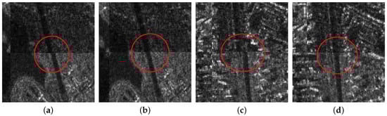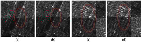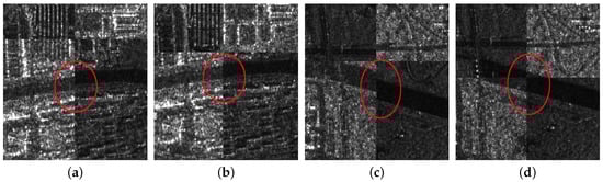 For the first image pair, since the size of the reference image is 810 × 1324, we set the sampling times as s = 3 . Operating the SAR-SIFT and AC-RANSAC methods on the sampled images, 22 pairs of corresponding points are extracted, which meets the requirement of the minimum correspondences. Then, the transformation model is estimated and the coarse registration is obtained by the model, shown in Figure 5c. From the enlarged sub-images shown in Figure 8a,c, we can see that there exists a deviation, such as misaligned edges. For the fine registration stage, we divide the reference and coarse-registered image into several 100 × 100 blocks, then Cps are extracted in each block. By using the ISPCC as the similarity metric, correspondences are obtained by searching a local region. The coarse-registered image is rectified by the correct correspondences. The enlarged subimages of the same region in the fine registration result are presented in Figure 8b,d. Compared with the subimages of the coarse registration result, the edges are precisely mosaicked.