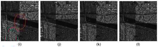 Figure 11. The comparative results of the second image pair. (a) The proposed method; (b) SAR-SIFT; (c) BFSIFT; (d) SIFT; (eh) the first enlarged images of the proposed method, SAR-SIFT, BFSIFT, SIFT; (il) the second enlarged images.